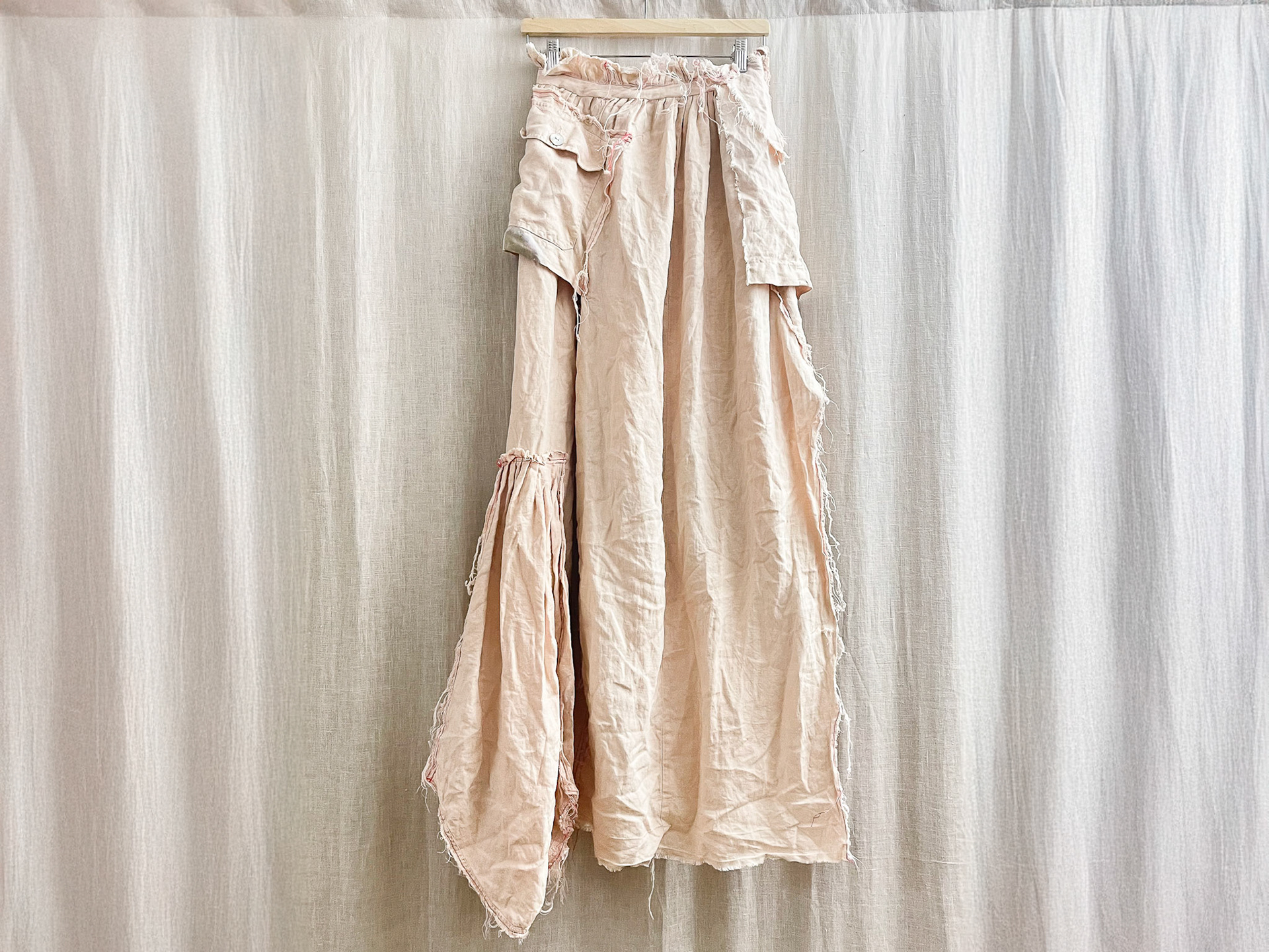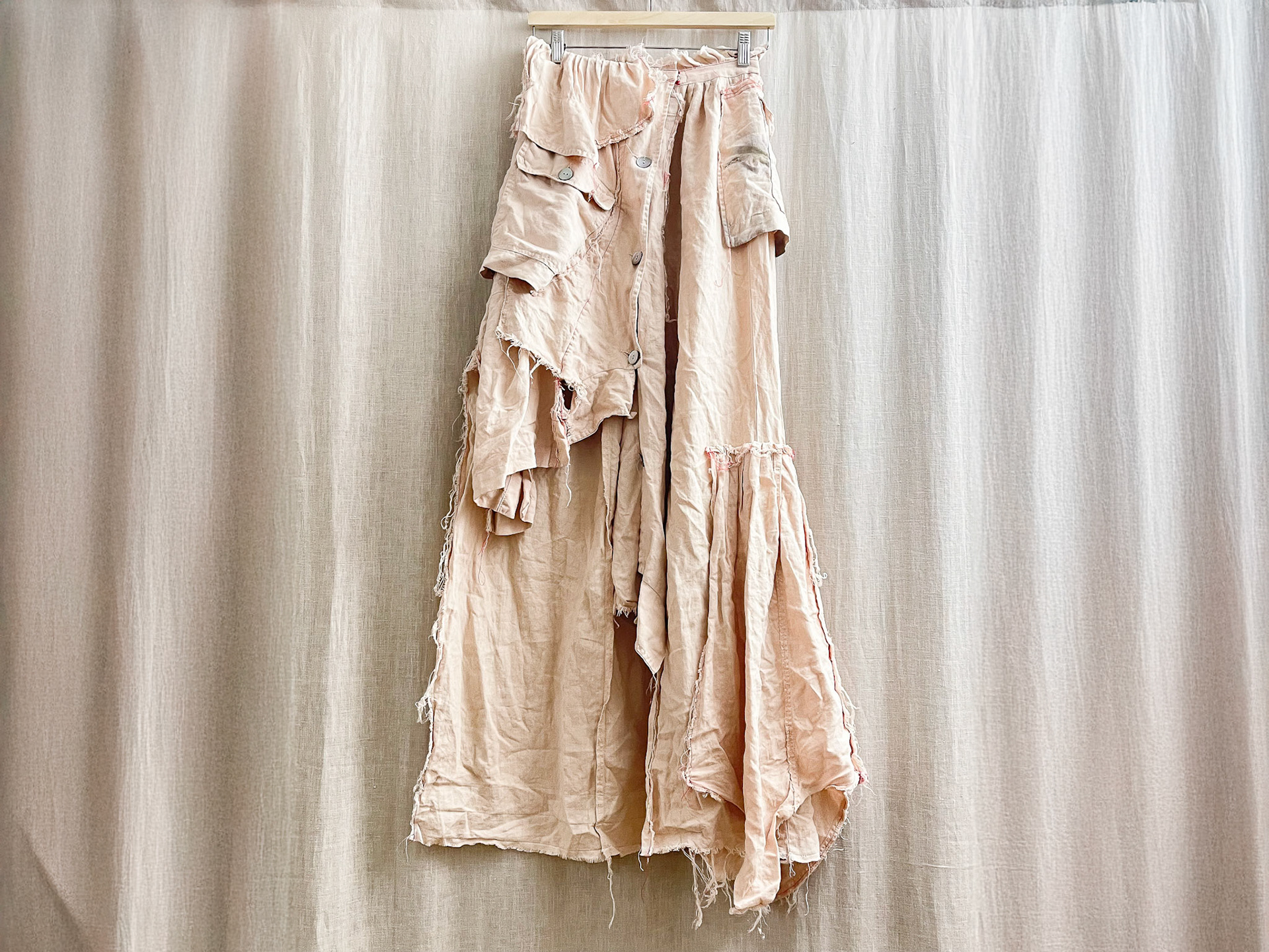 The Buried Linen Cargo Raw Edge Skirt is a reworked garment created from a 100% linen matching set dating to the 1970s. The original material was carefully disassembled and reconstructed, allowing the natural qualities of the linen—its breathability, texture, and tendency toward graceful wear—to remain visible. Raw edges are intentionally preserved, emphasizing the garment’s material honesty and the marks of its transformation.