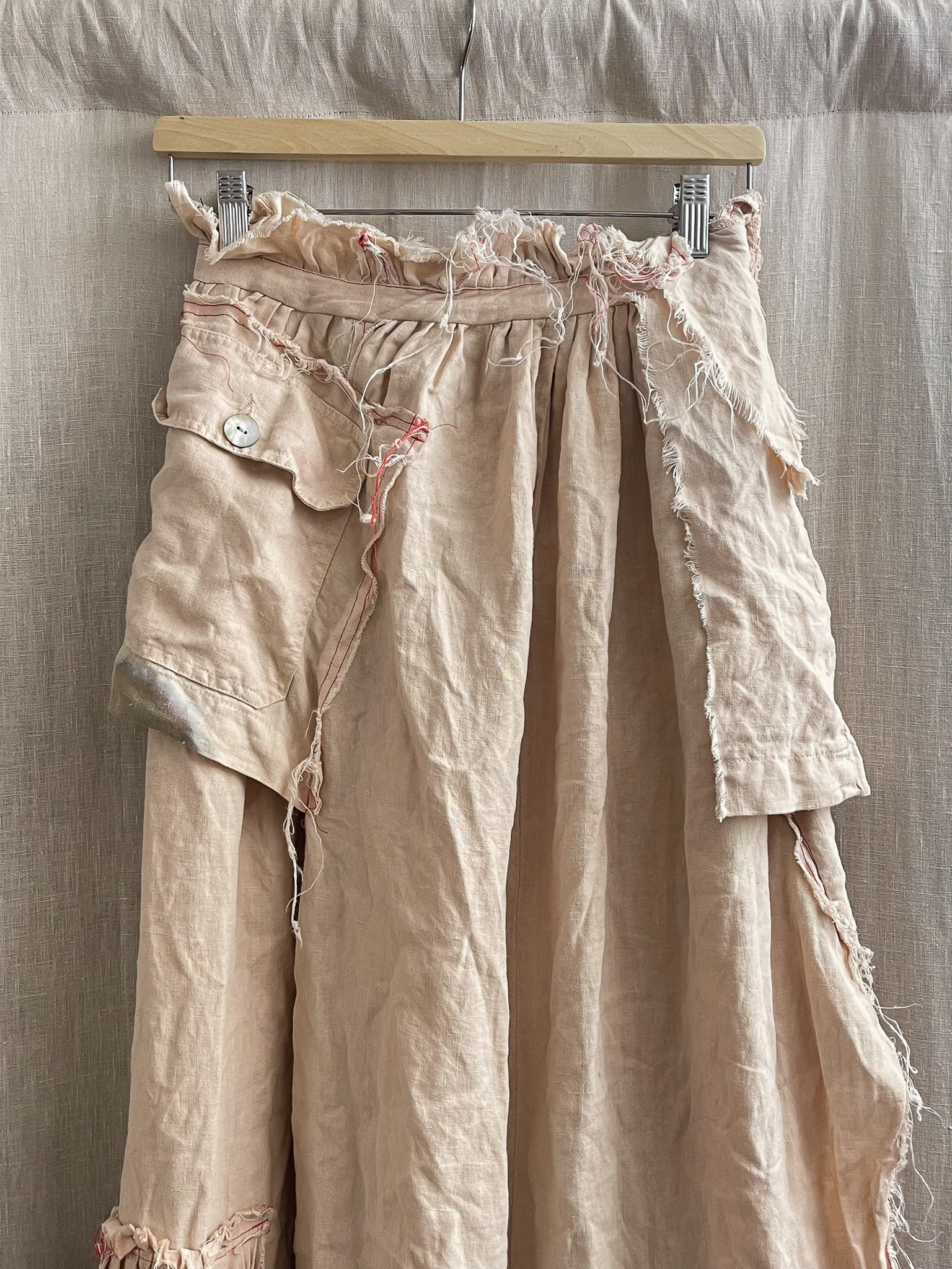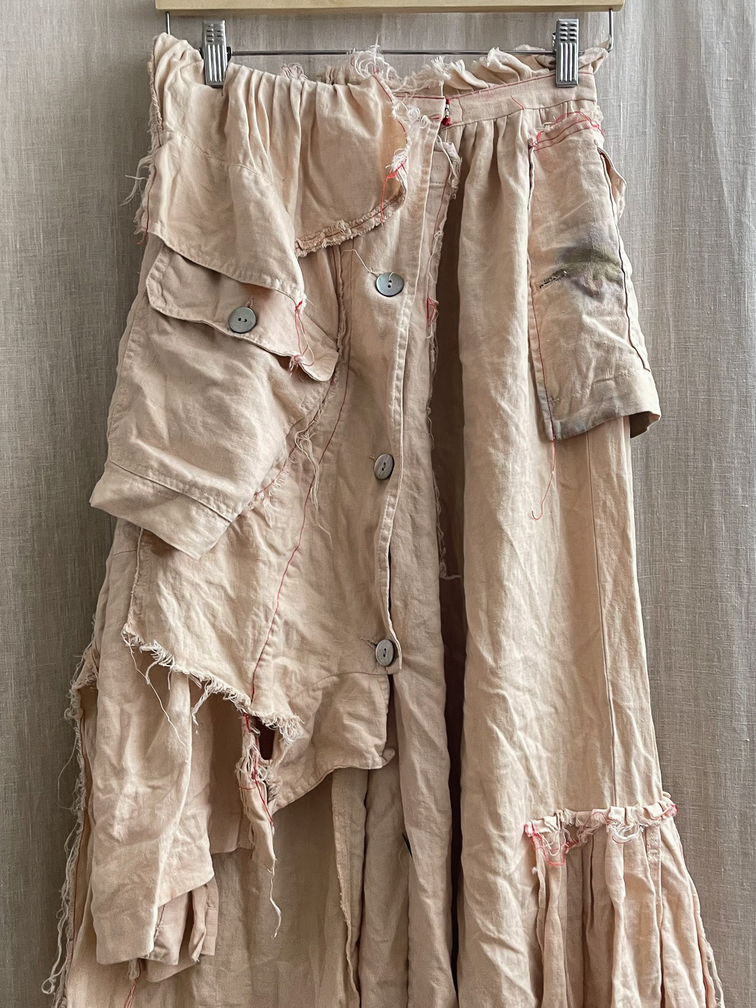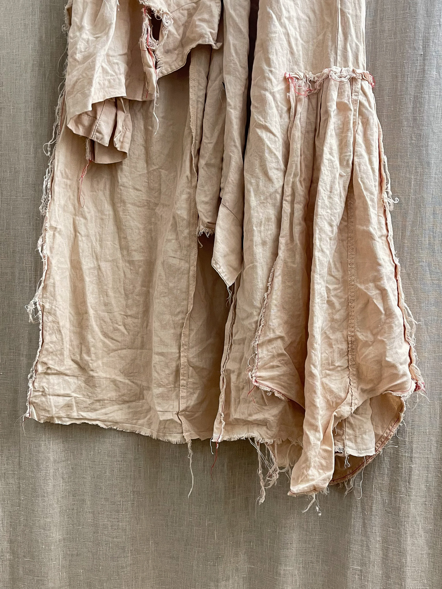 The skirt is sewn together using red 100% cotton Mako Egyptian thread, chosen for its strength and subtle contrast against the linen ground. The visible stitching functions both structurally and visually, tracing the hand of the maker while reinforcing the garment’s sense of assembly and repair. Rather than concealing construction, the seams highlight the process of making as an integral part of the final form.