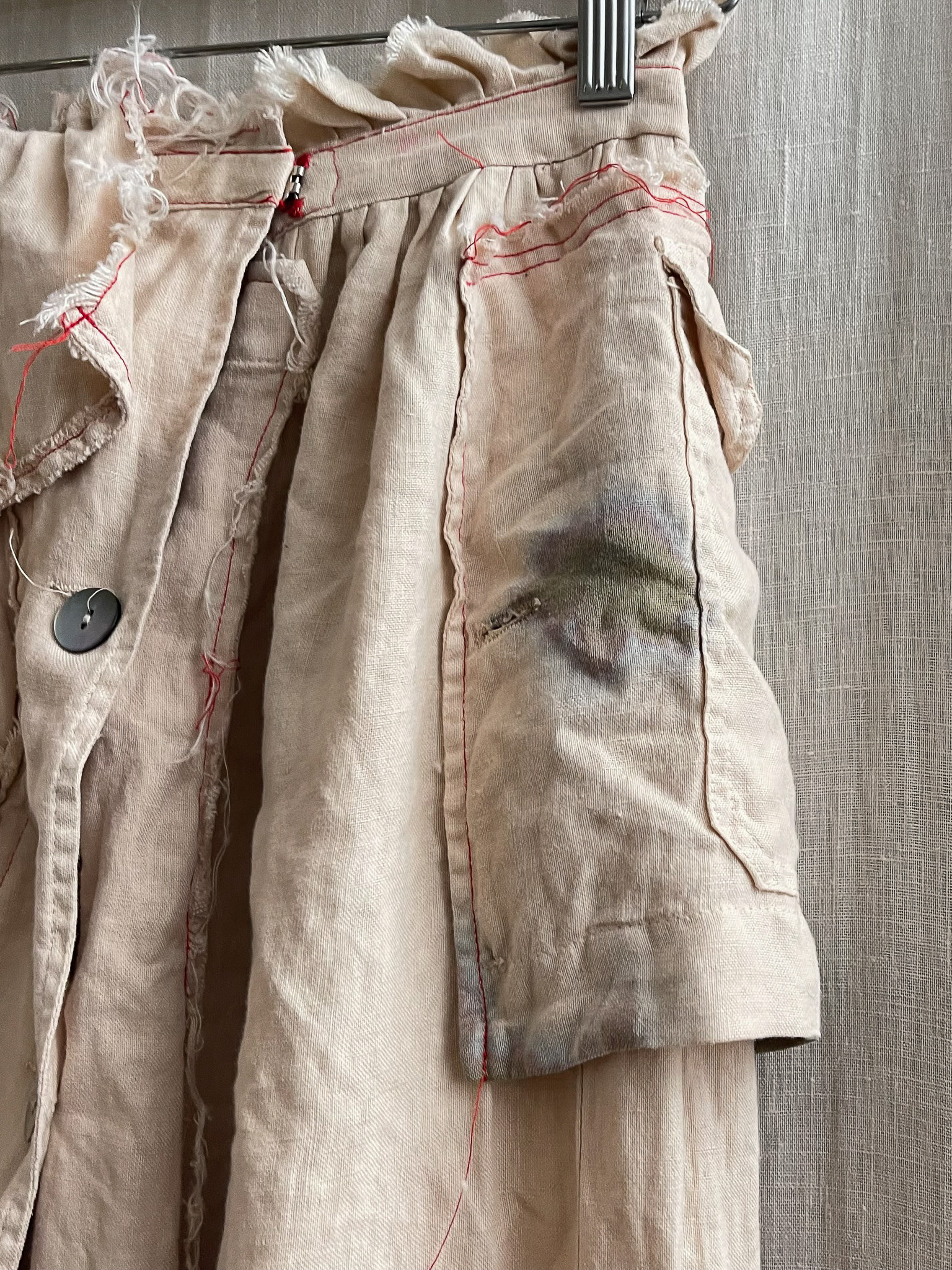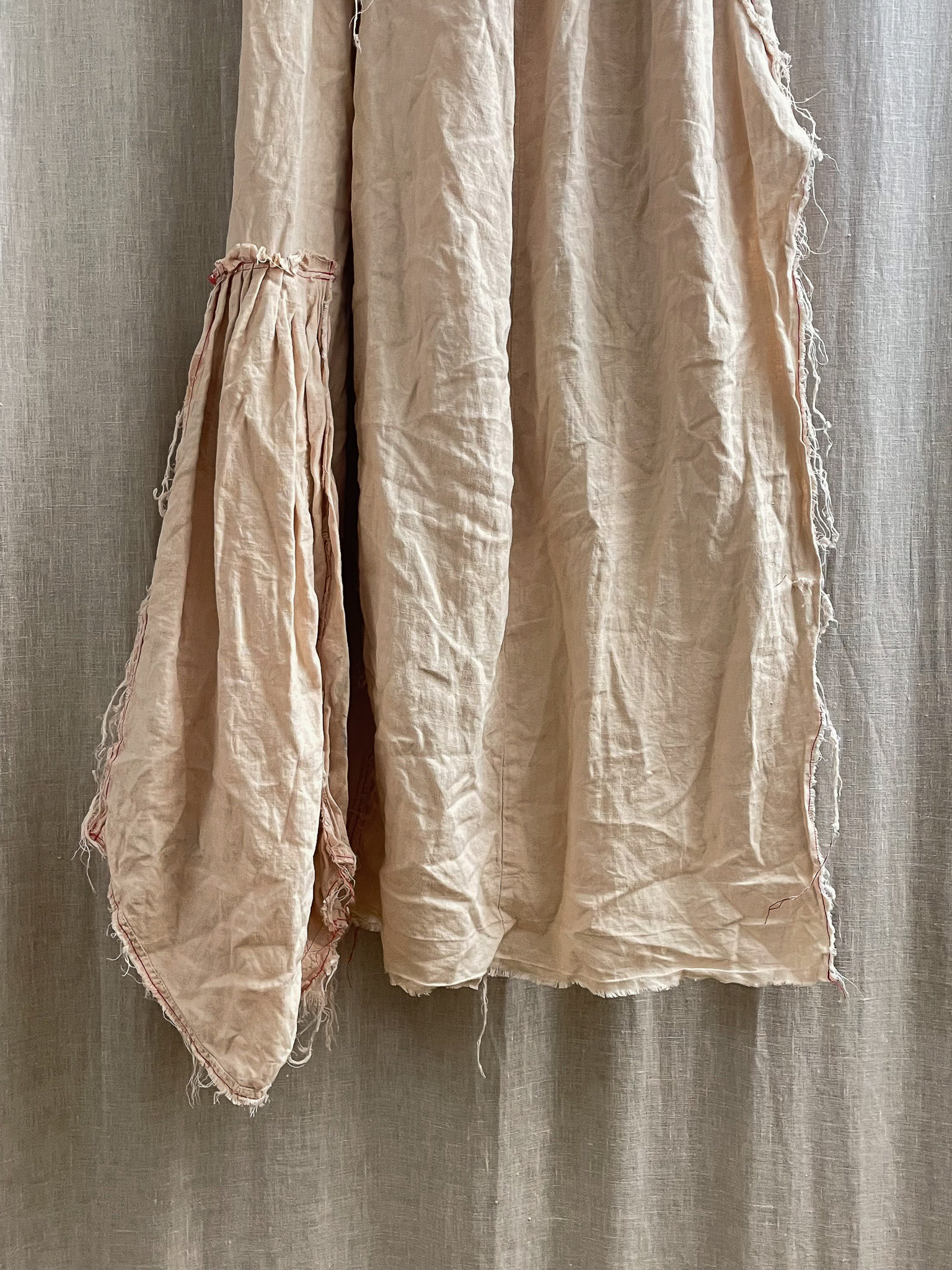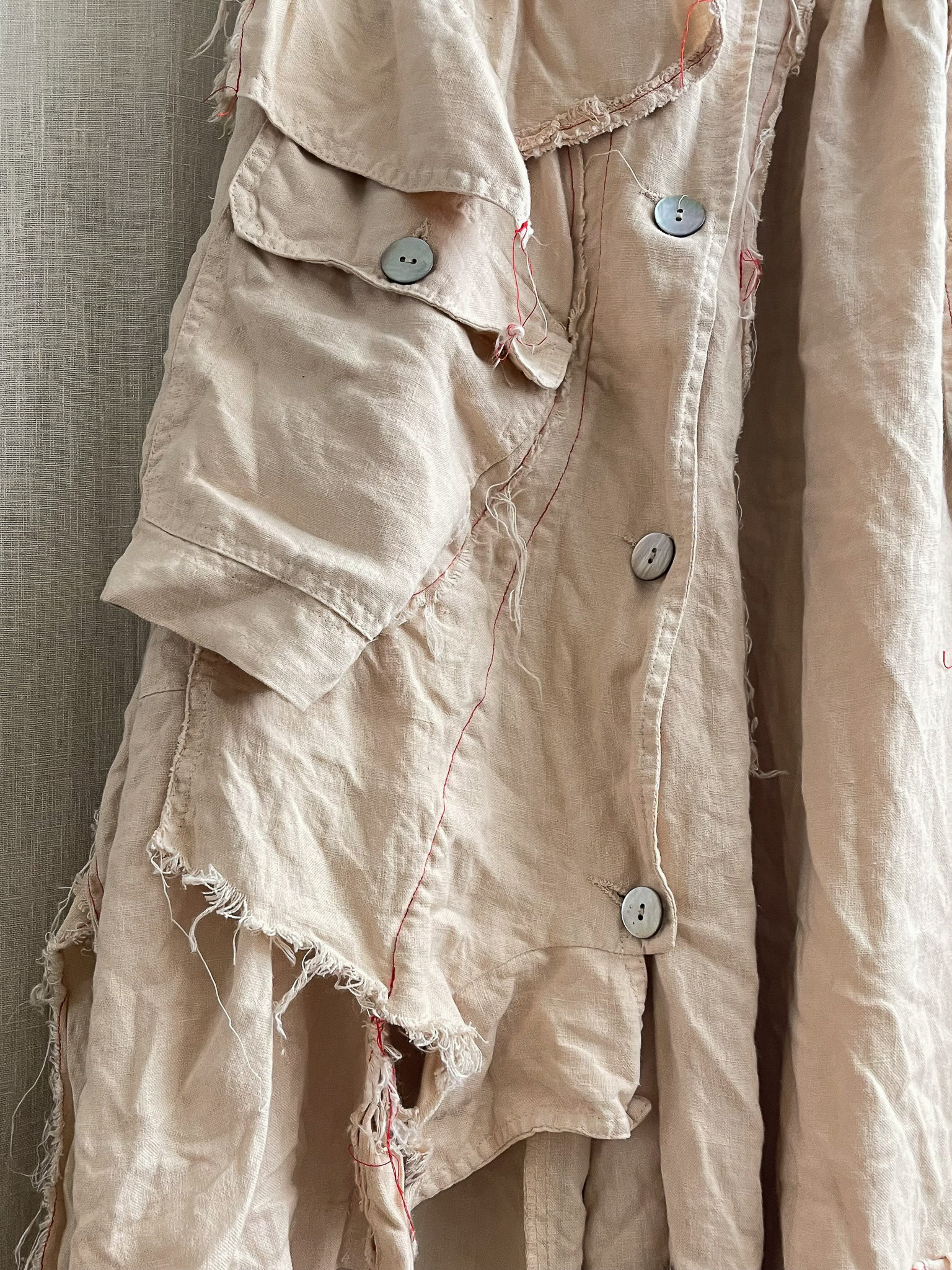 The skirt is sewn together using red 100% cotton Mako Egyptian thread, chosen for its strength and subtle contrast against the linen ground. The visible stitching functions both structurally and visually, tracing the hand of the maker while reinforcing the garment’s sense of assembly and repair. Rather than concealing construction, the seams highlight the process of making as an integral part of the final form.