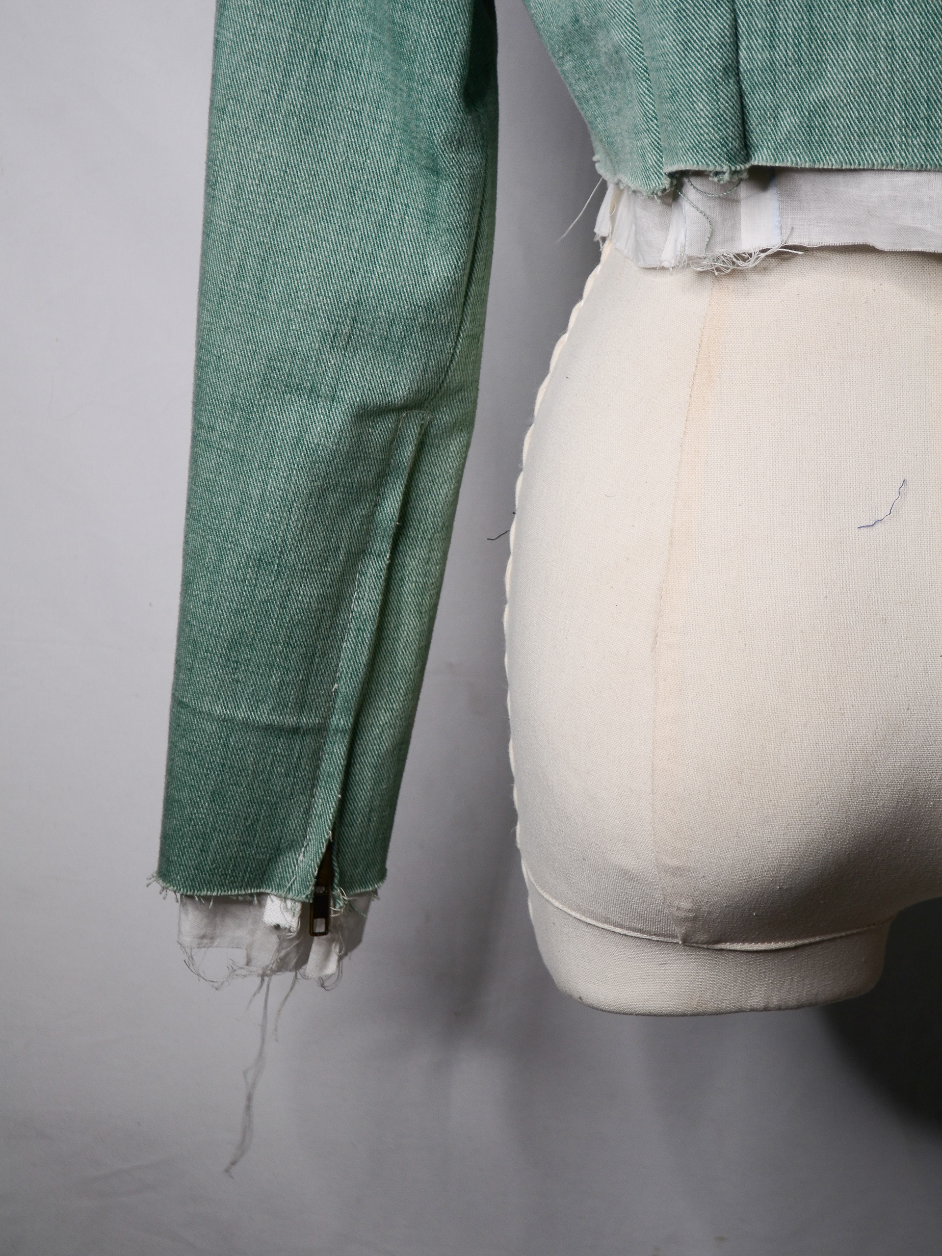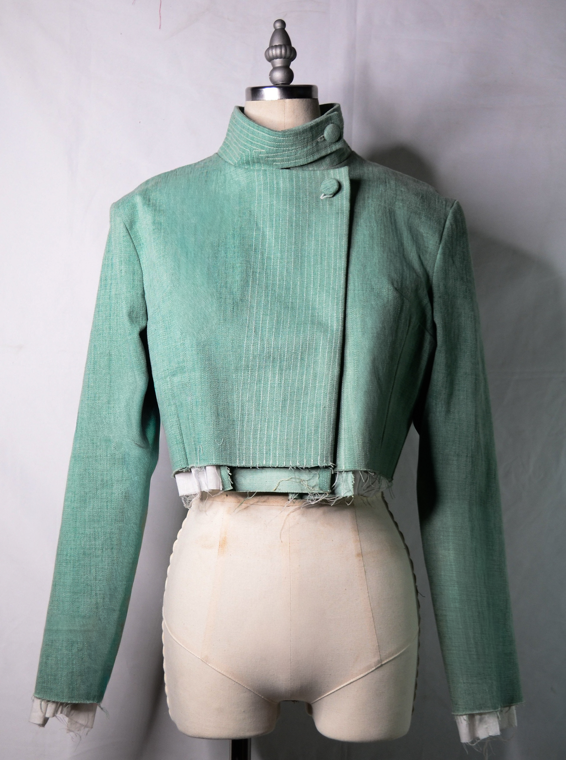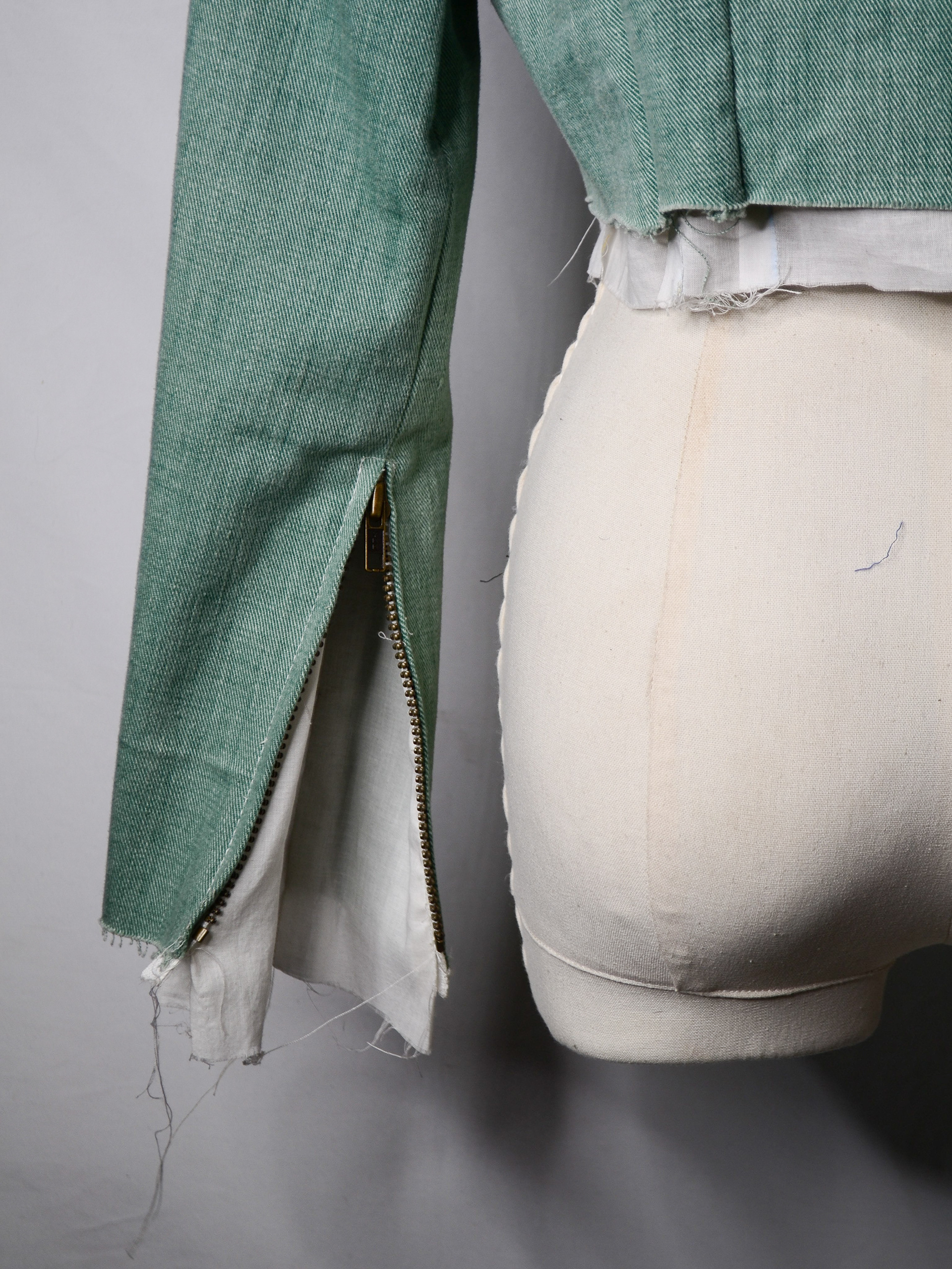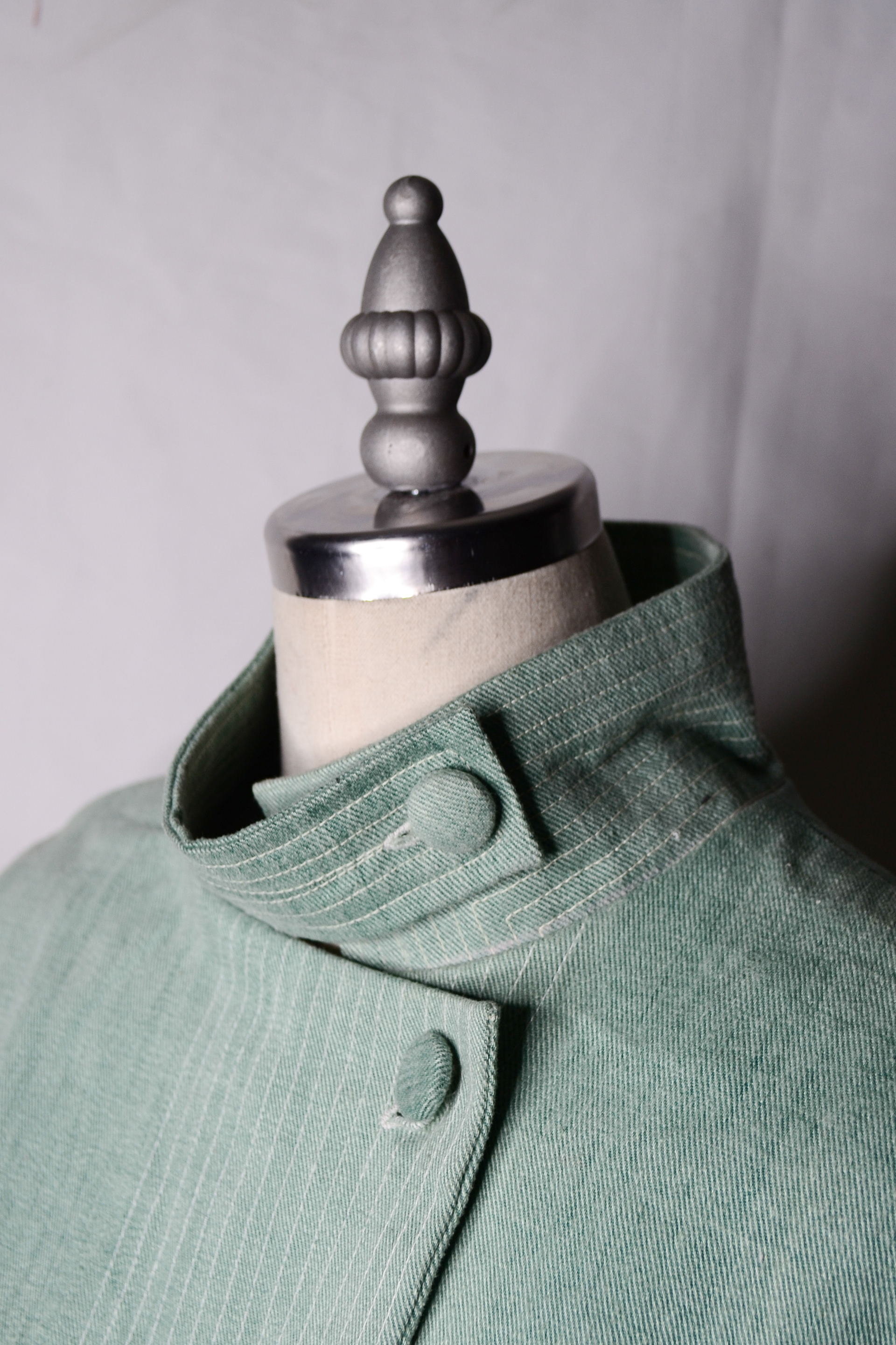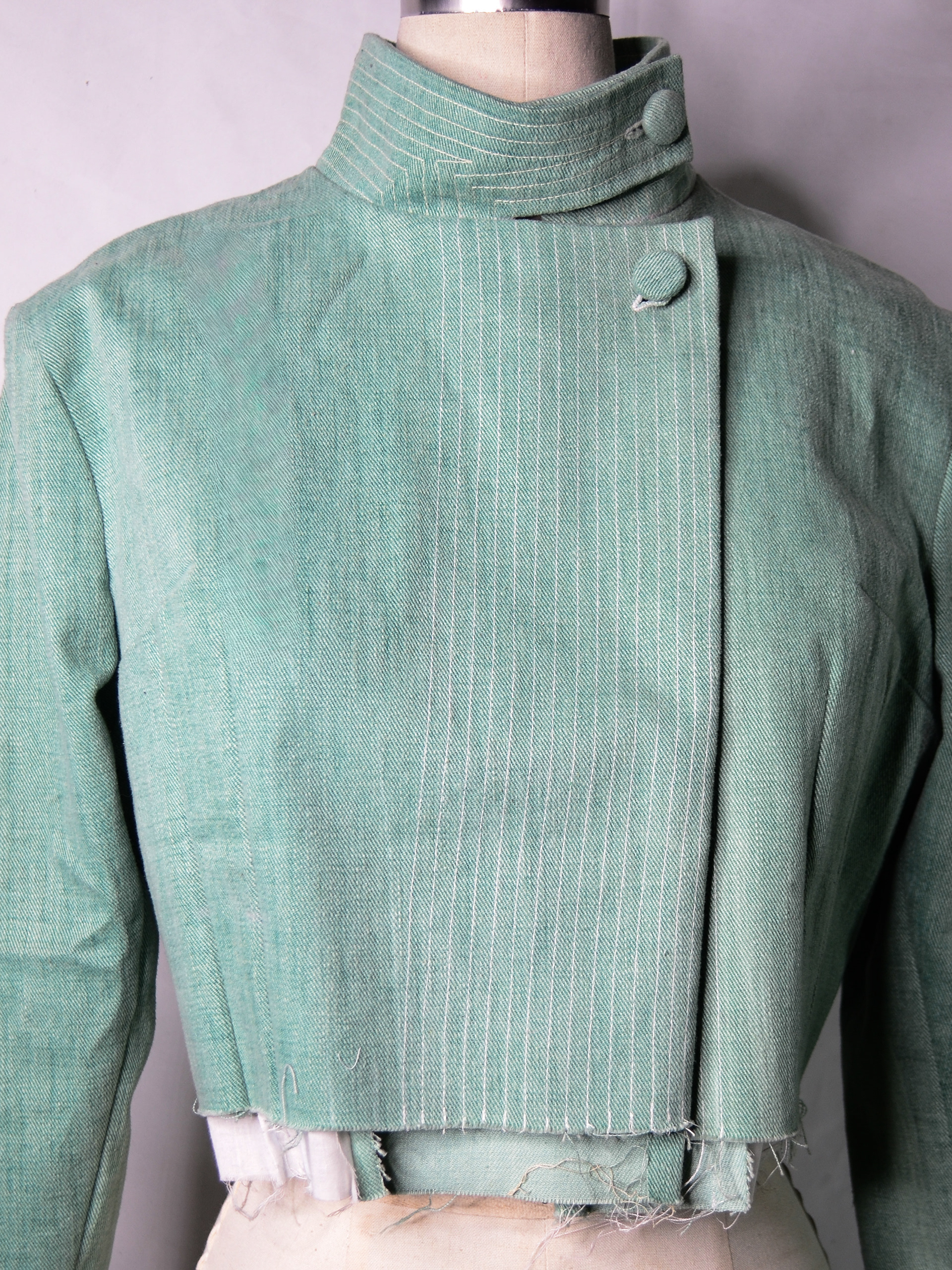 Structural integrity is achieved through column stitching, used in place of conventional stiffening methods such as fusible interfacing. This choice avoids the use of adhesive-based materials, which often contain harmful glue chemicals, and instead relies on stitch work to create strength and form. The entire jacket is assembled using 100% mercerized cotton thread from the 1950s, reinforcing both durability and continuity with historical garment-making practices.