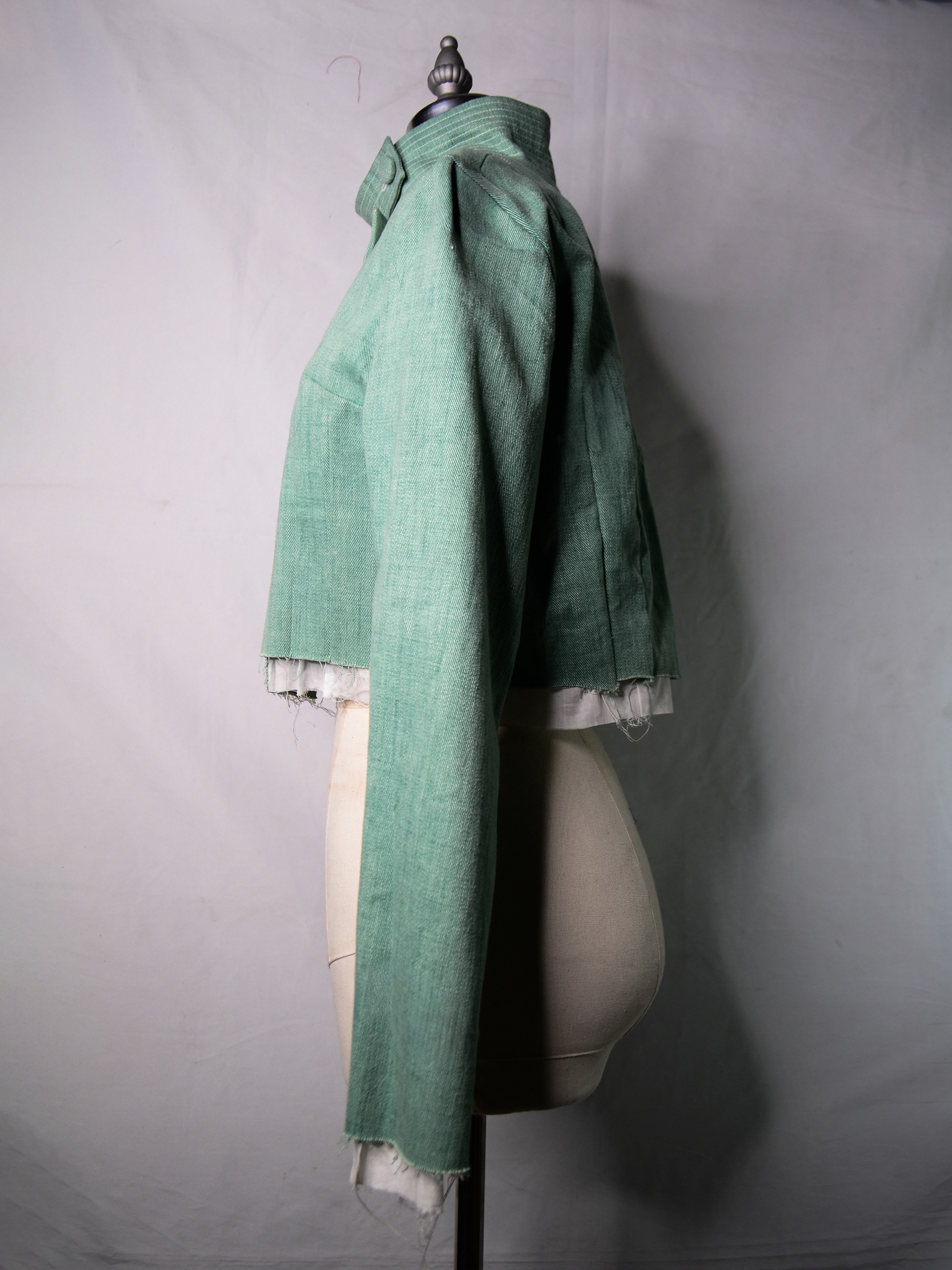 The Rheme Ragaza Copper Green Cropped Fencing Jacket is constructed from copper green denim jobber fabric, selected for its weight, durability, and muted depth of color. The cropped silhouette references utilitarian fencing and training garments, balancing structure with ease of movement. The fabric’s surface holds a quiet strength, allowing the form of the jacket to speak without excess embellishment.