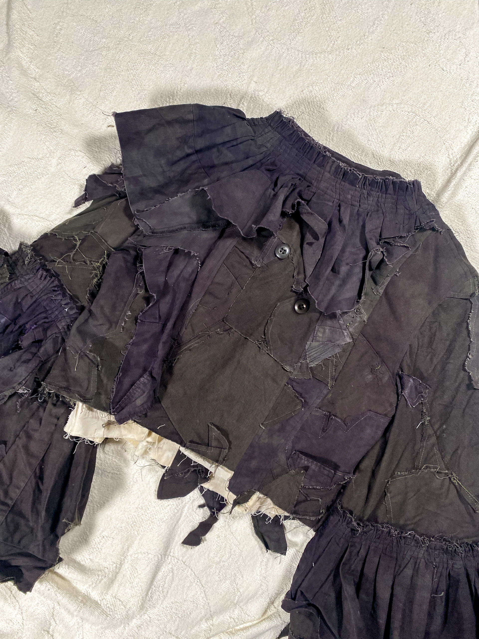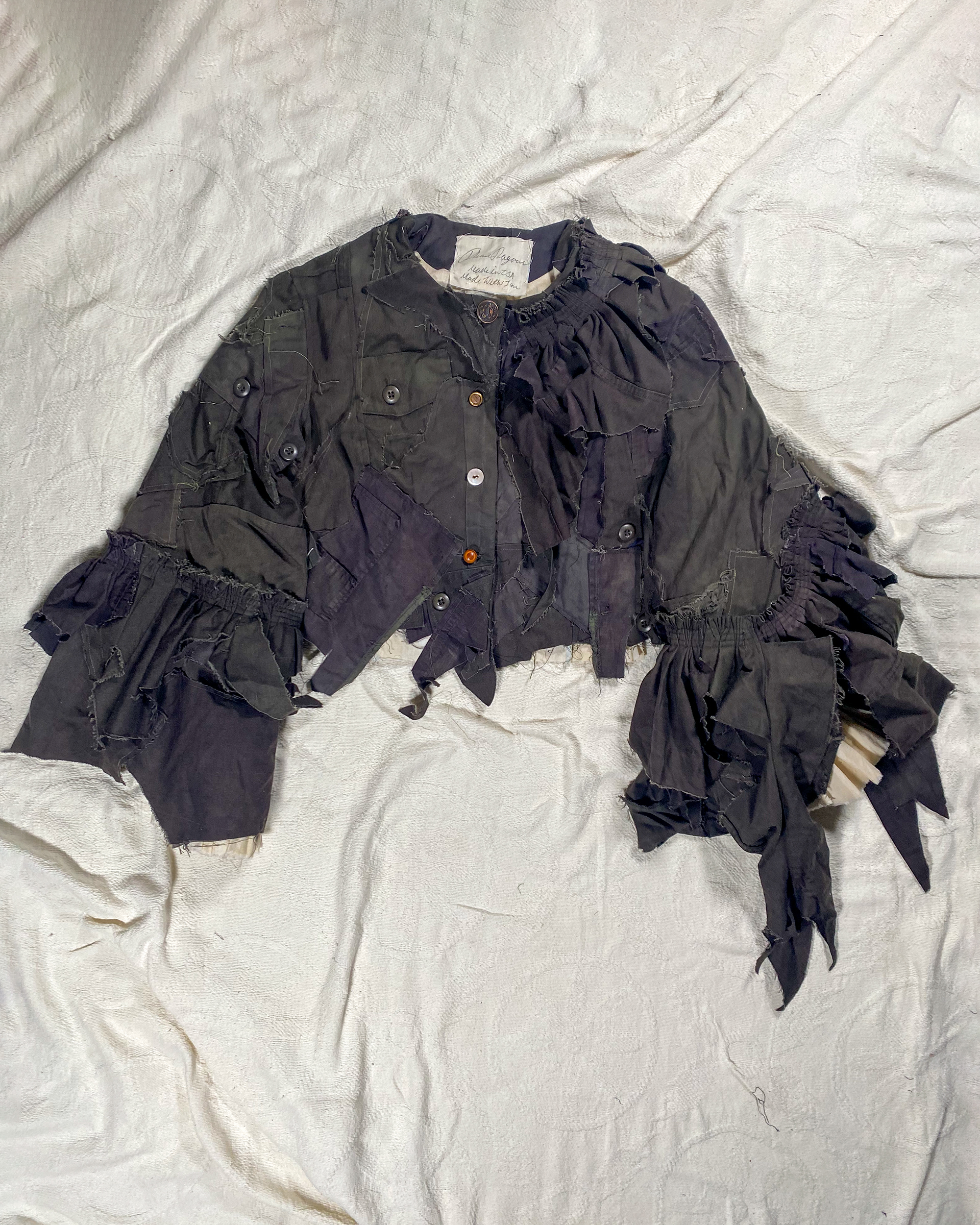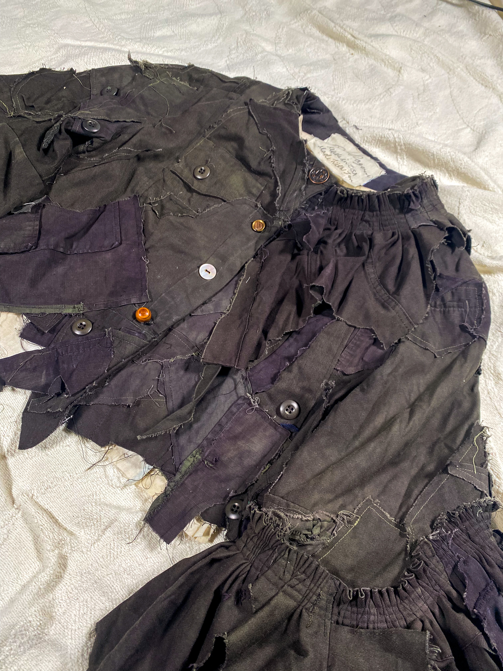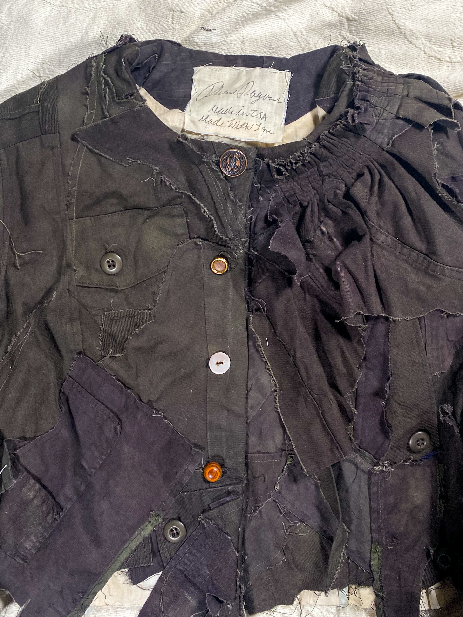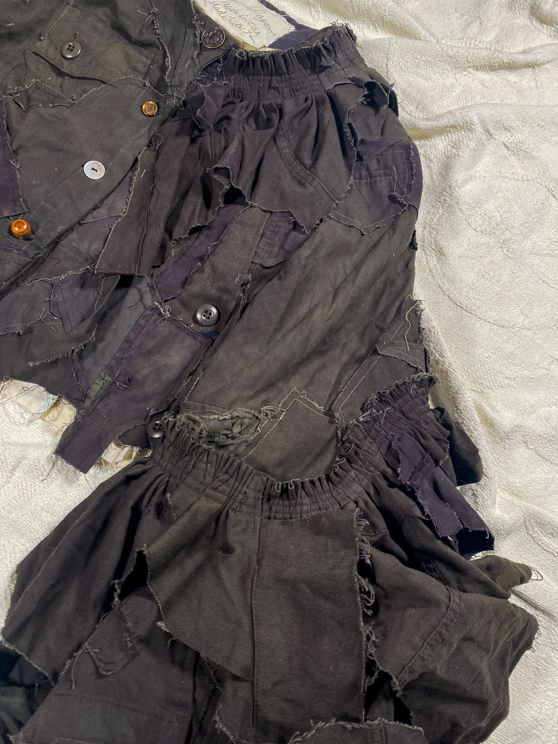 Vintage 40s-60s Flawed military fatigues were cut into scraps, sewn together, and then dyed with black logwood extract from a sustainable tree farm in Mexico.