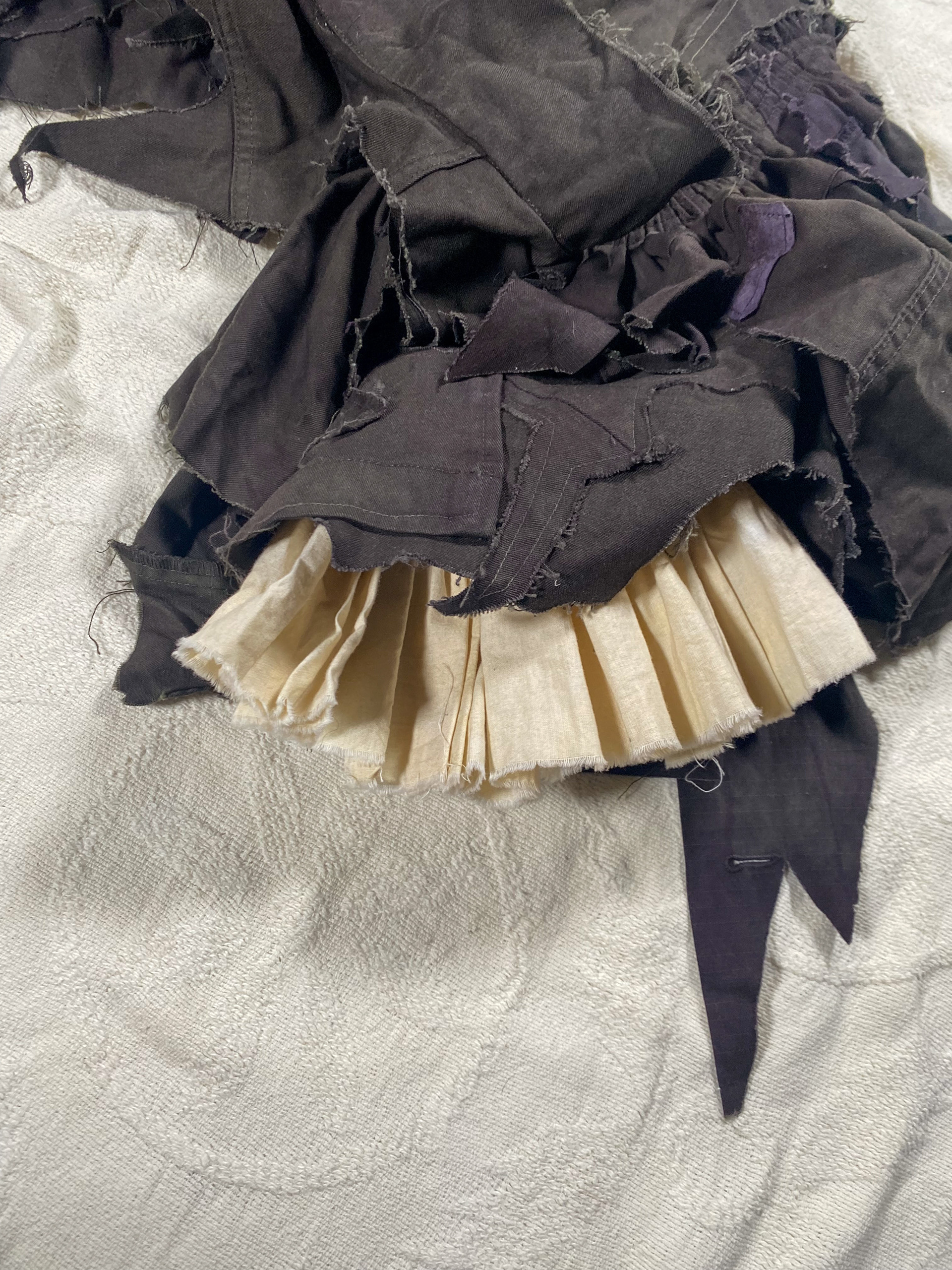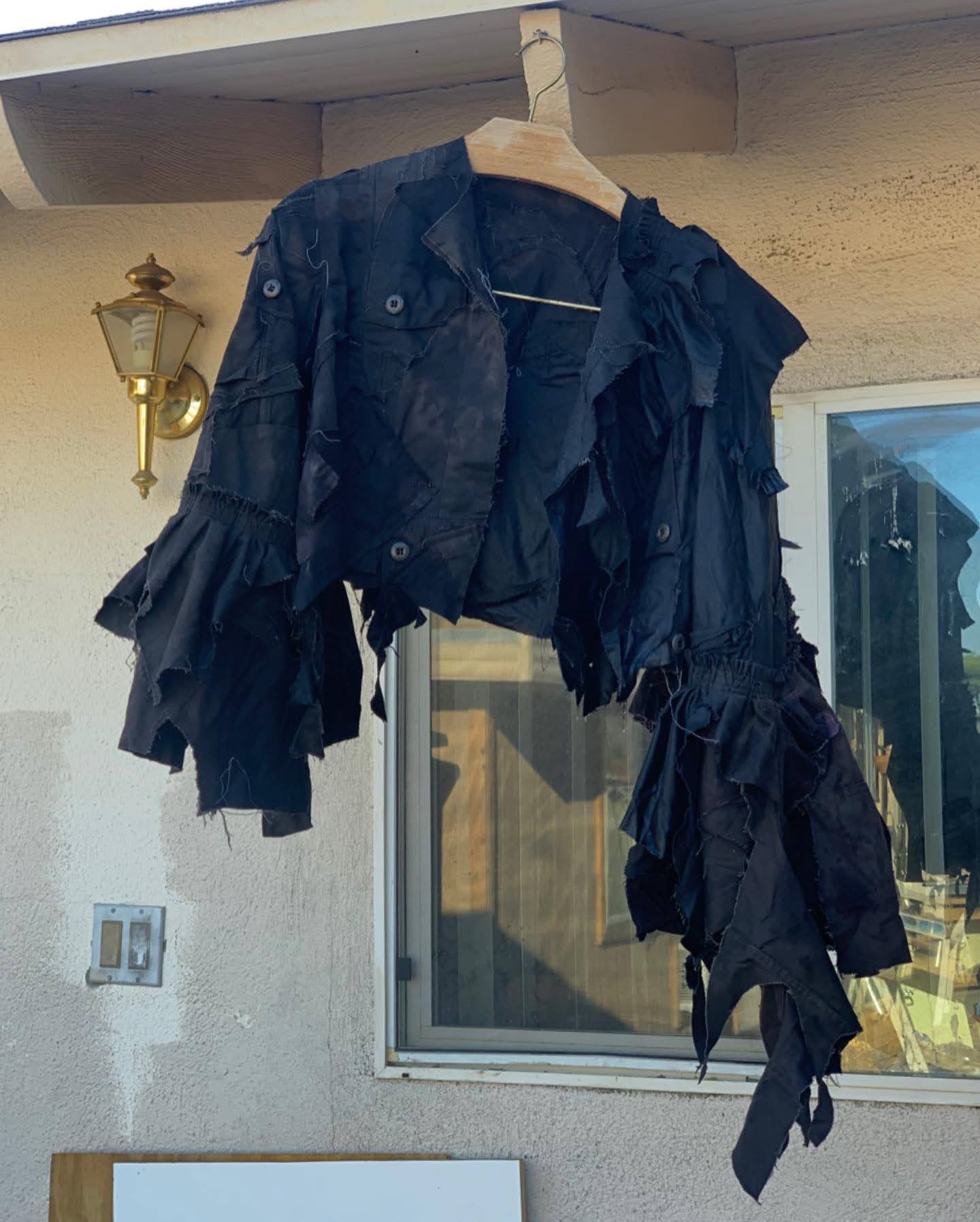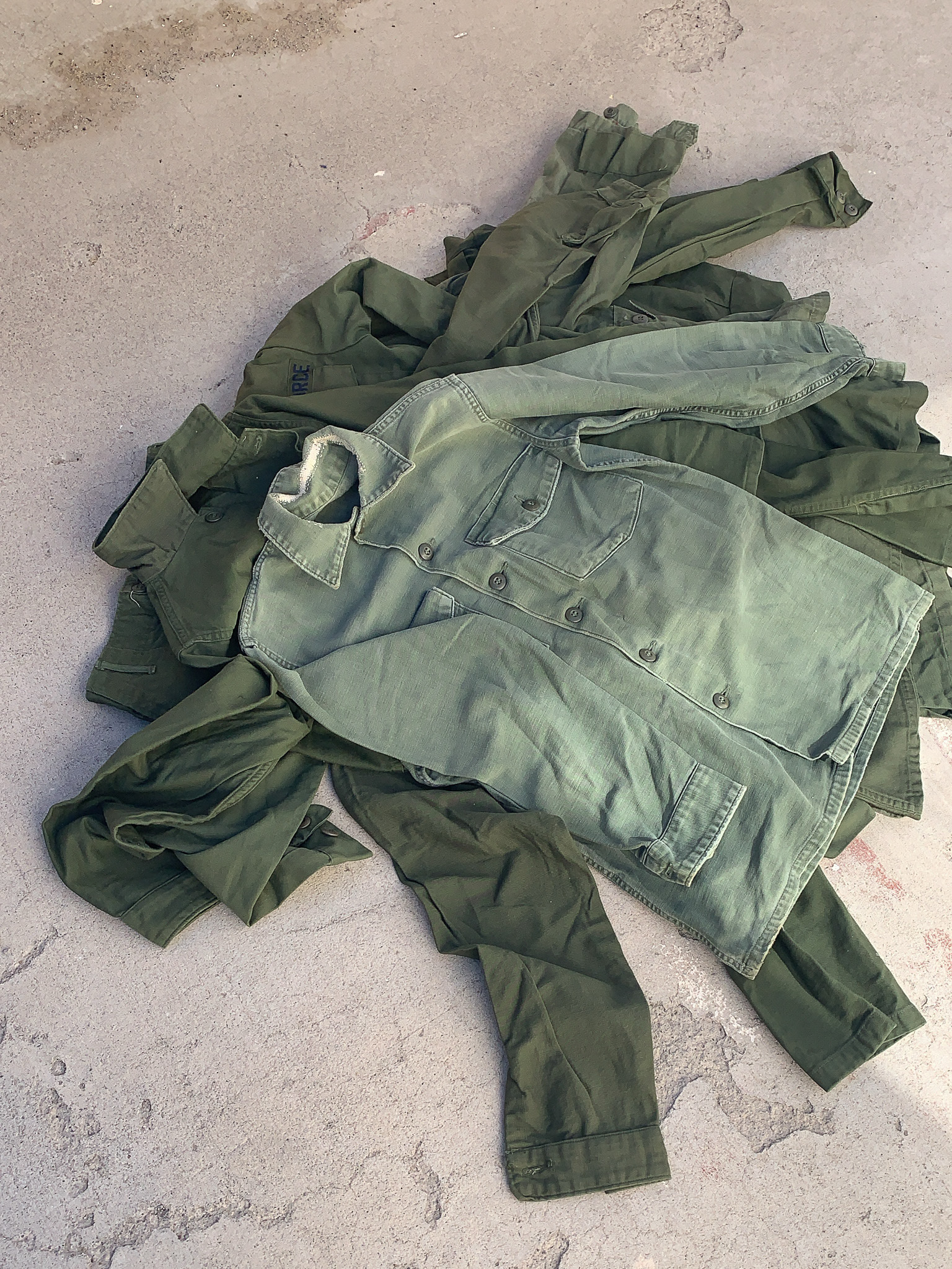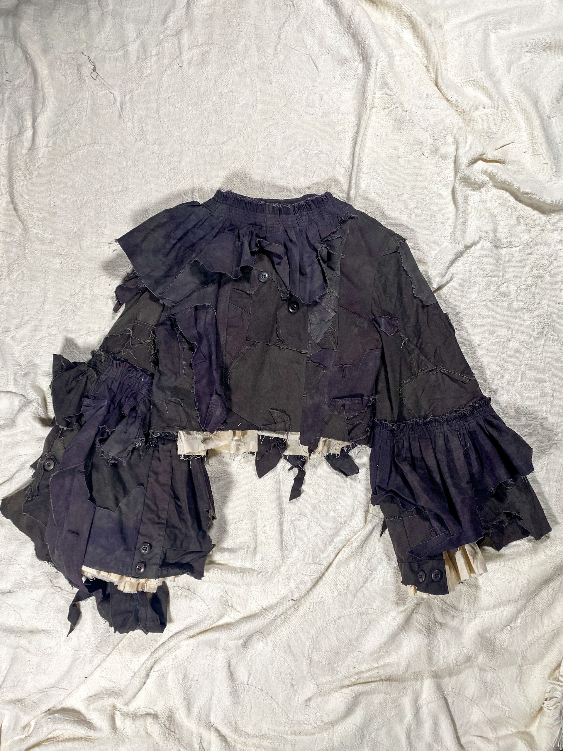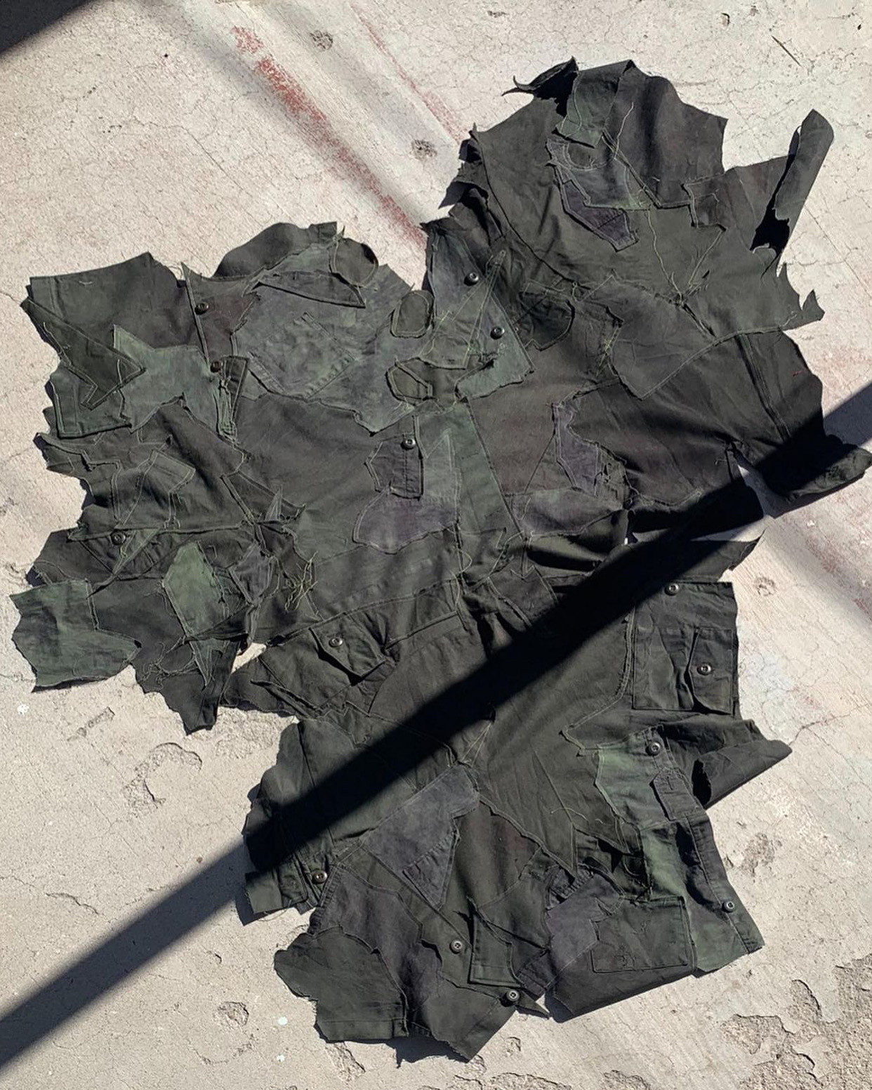 Vintage 40s-60s Flawed military fatigues were cut into scraps, sewn together, and then dyed with black logwood extract from a sustainable tree farm in Mexico.