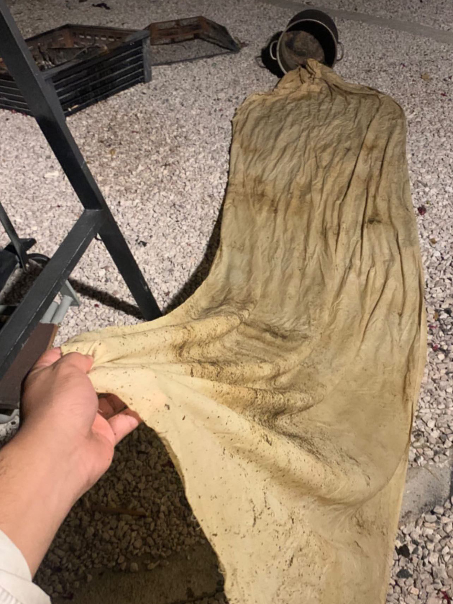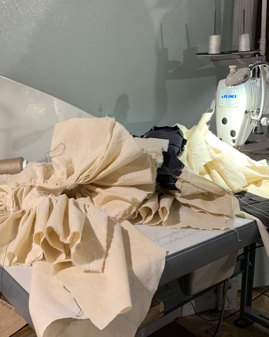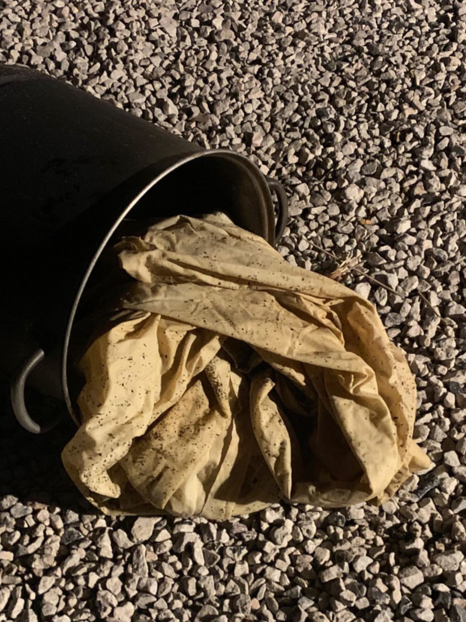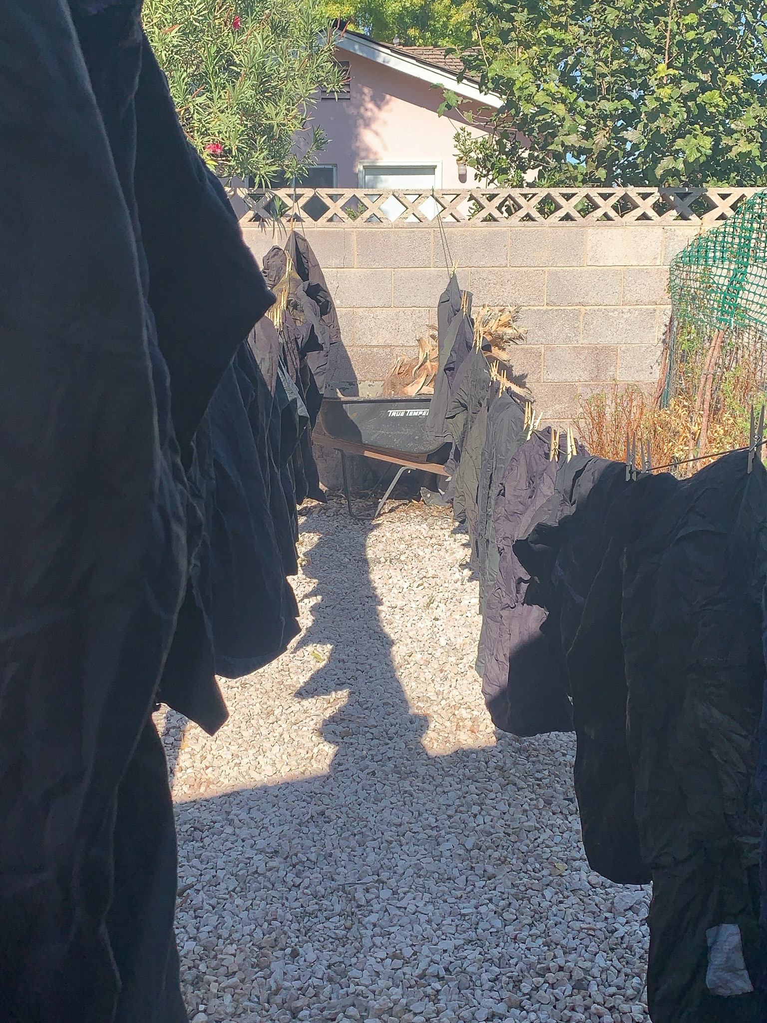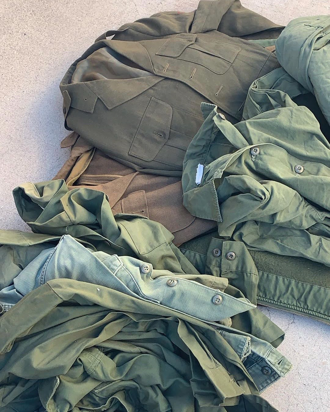 Vintage 40s-60s Flawed military fatigues were cut into scraps, sewn together, and then dyed with black logwood extract from a sustainable tree farm in Mexico.